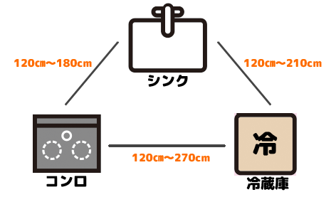 このように、シンク~コンロ間は120㎝~180㎝、コンロ~冷蔵庫間は120㎝~270cm、冷蔵庫~シンク間は120㎝~210cmの範囲内に正三角形を意識して配置するとキッチンの使い勝手が大幅に向上します。