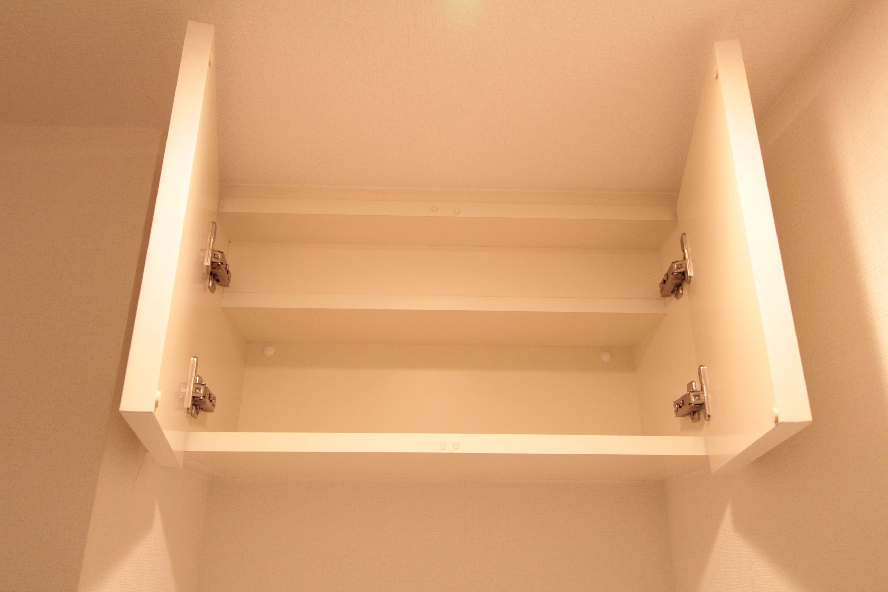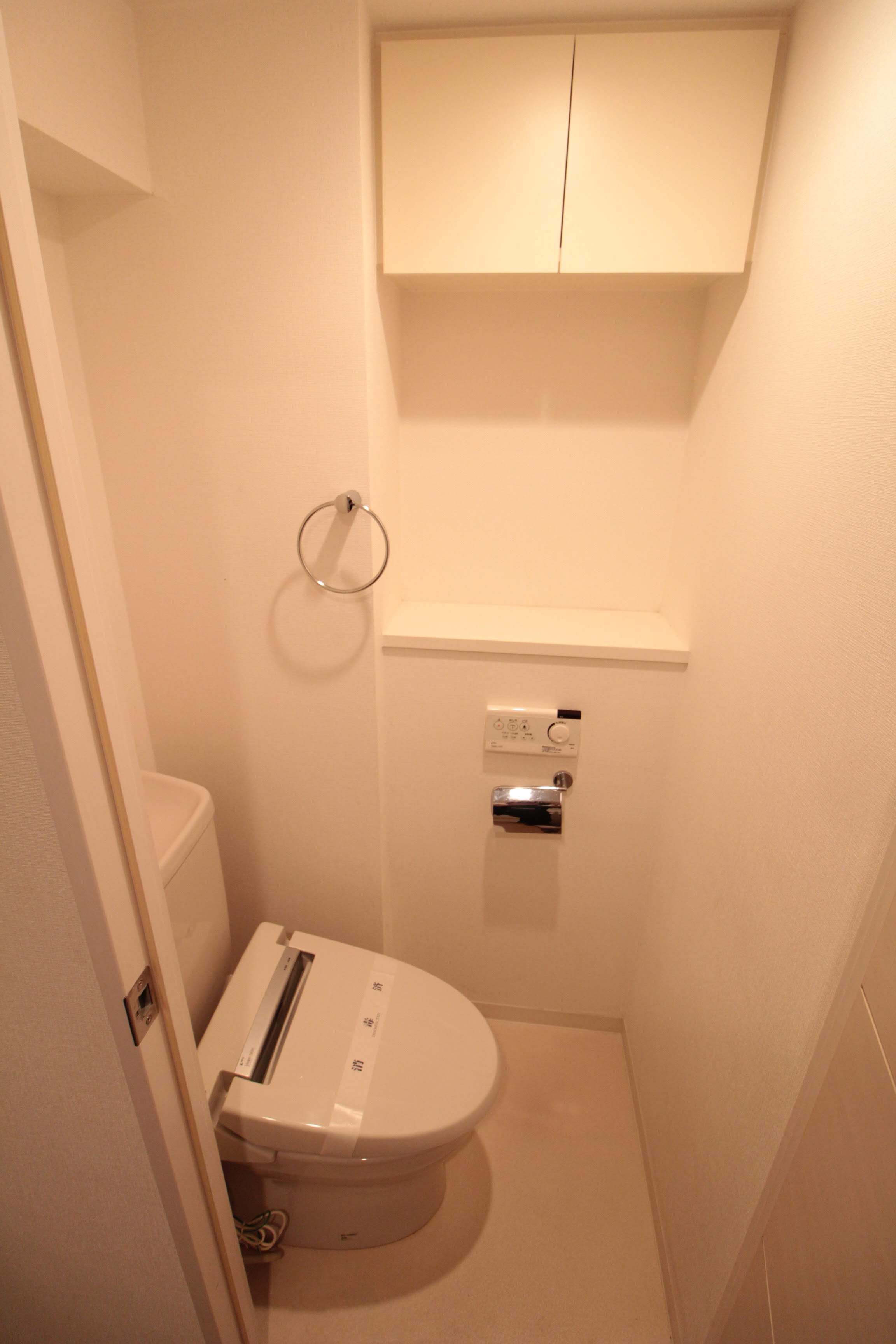 トイレは少し狭めですが、上部に収納棚やタオル掛け、カウンターもついています。