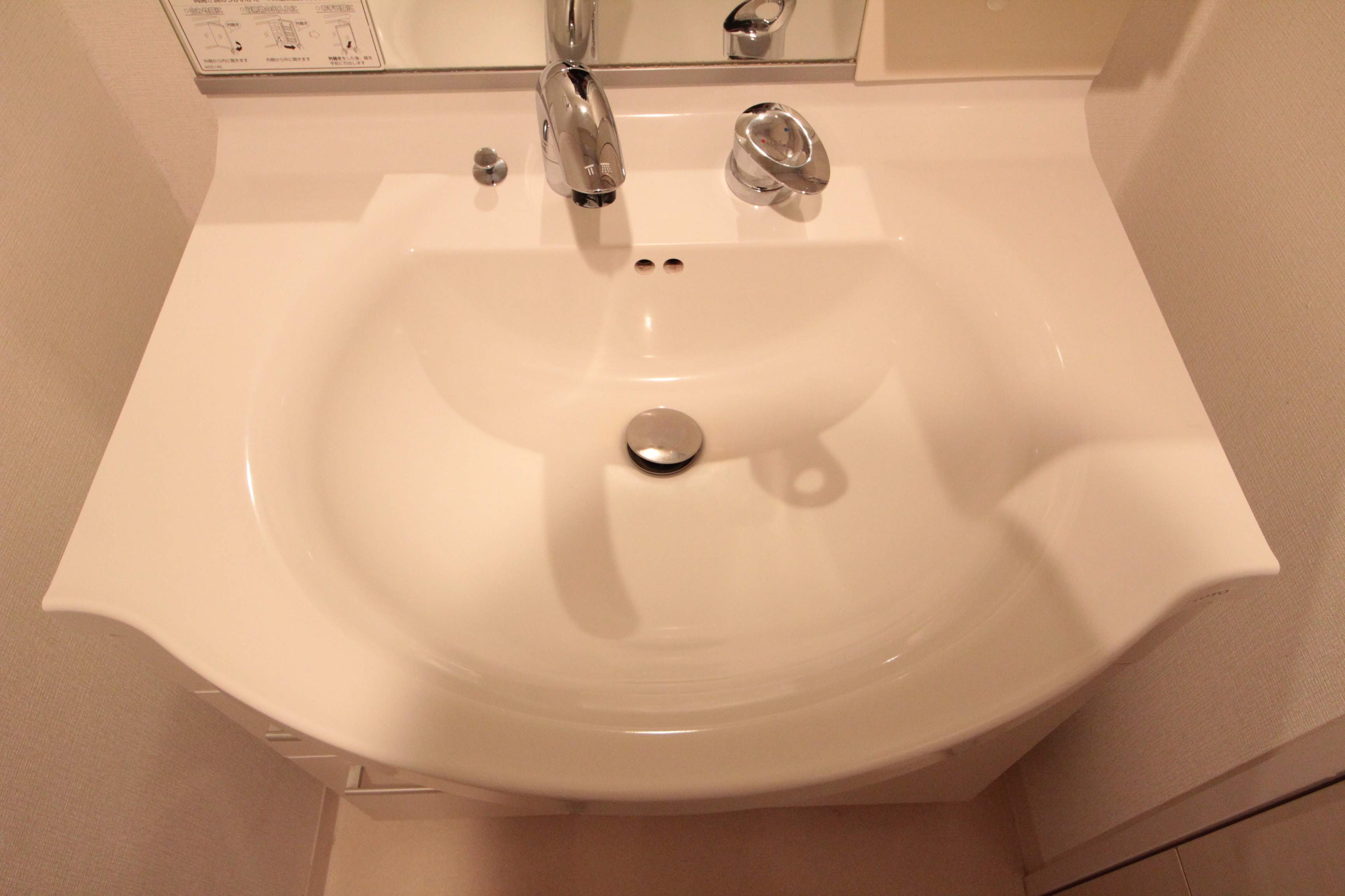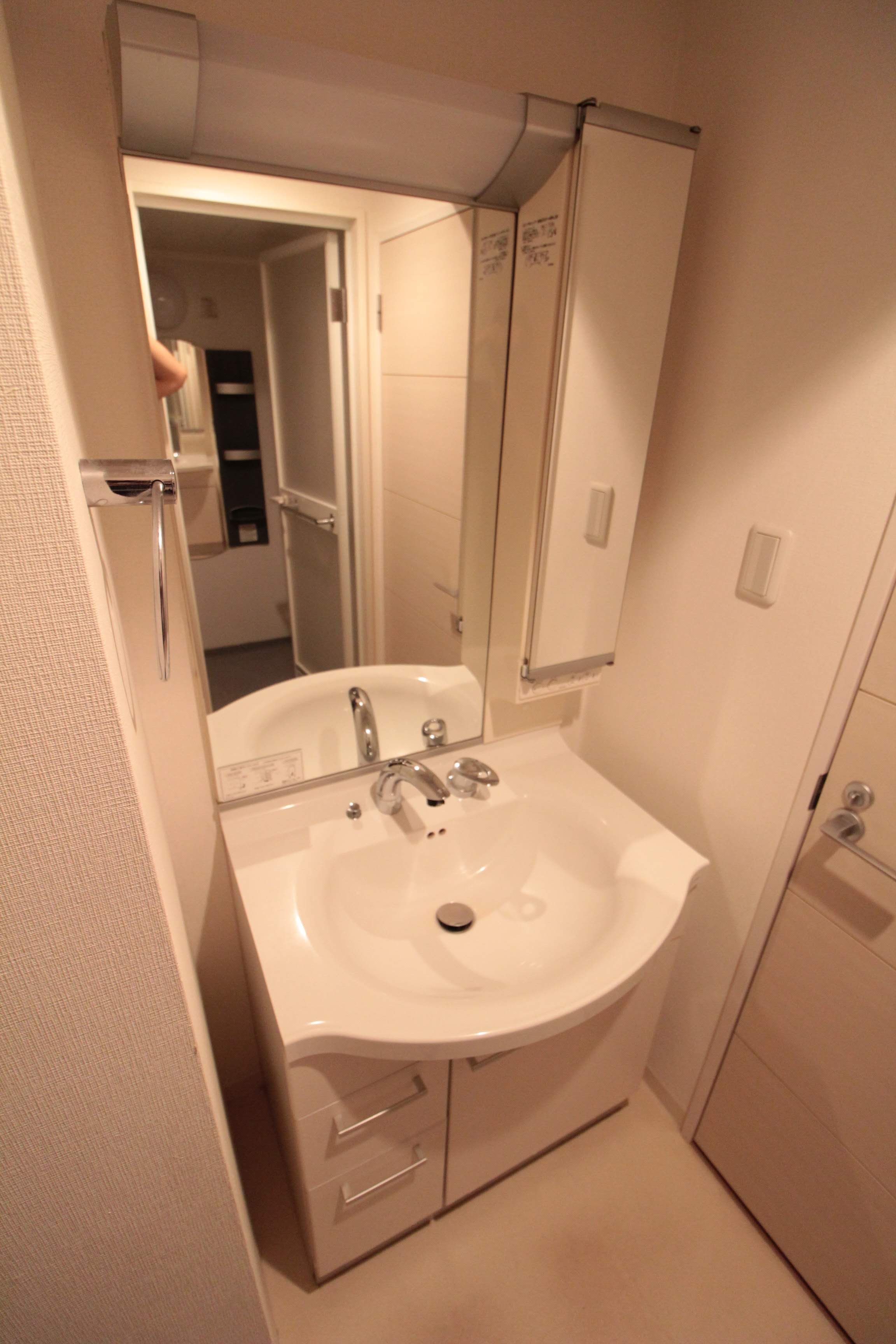 洗面所は大きなミラーが特徴的な最新型の独立洗面所です。