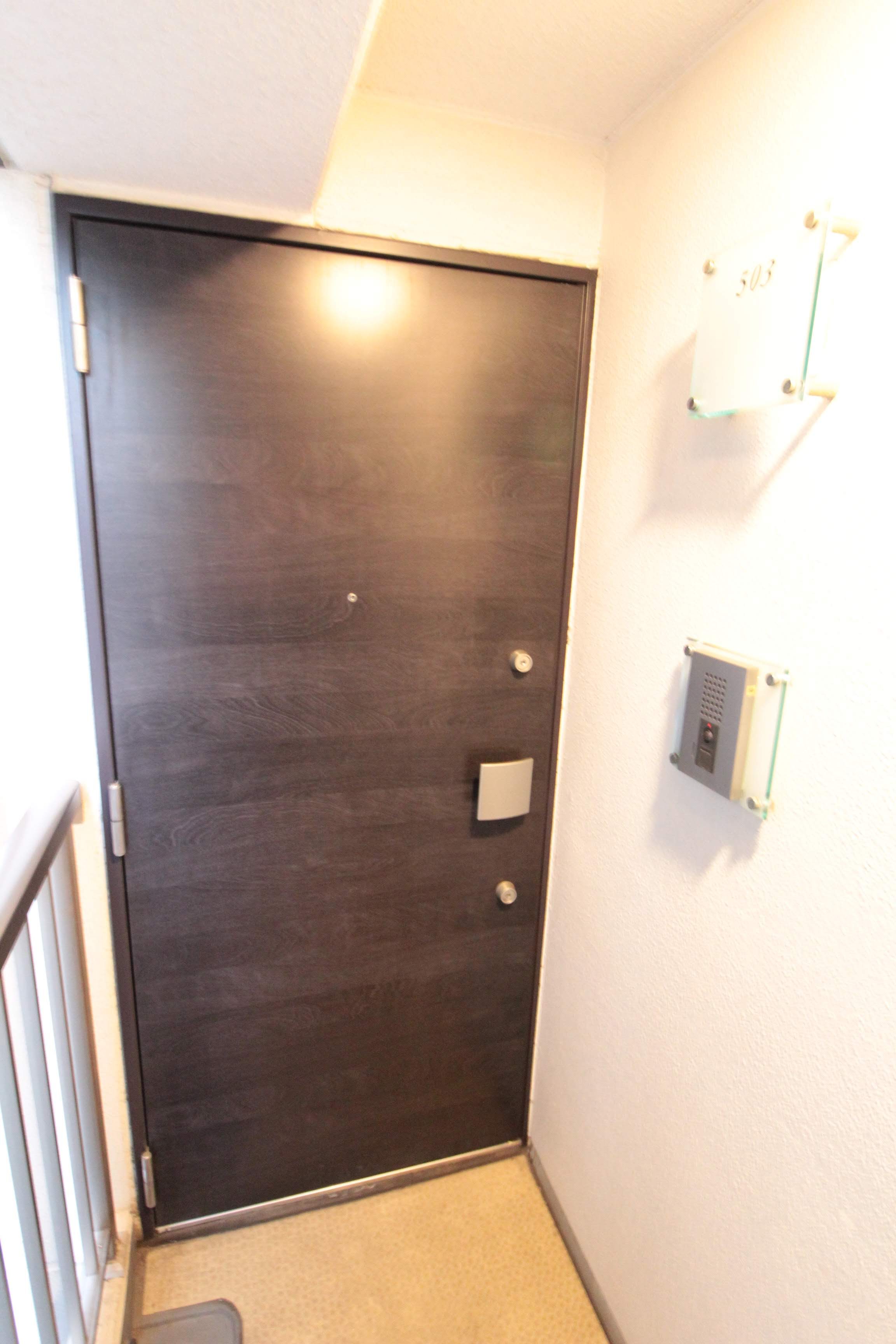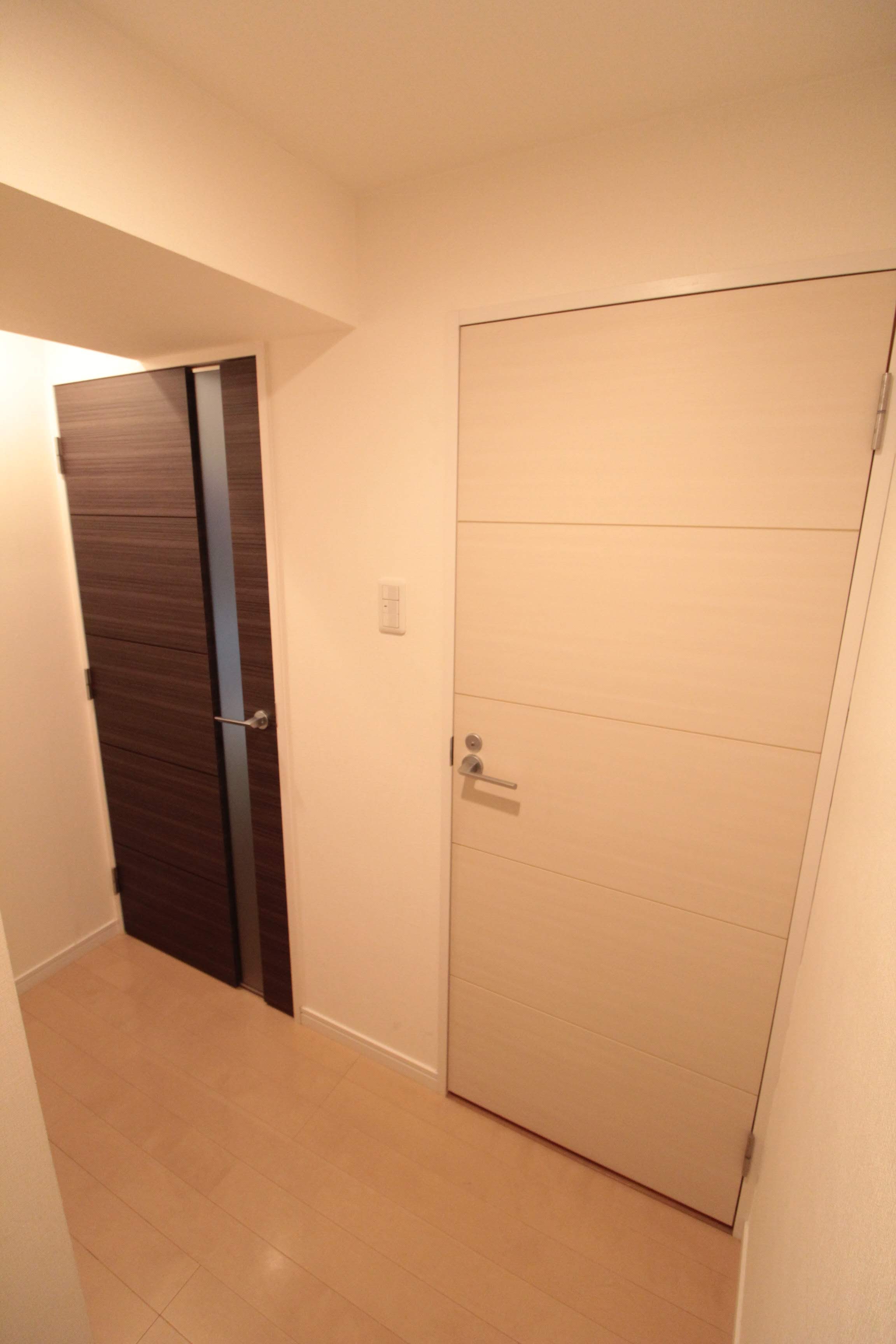 右がトイレで、左のダークブラウンのトビラがリビングダイニングへ続きます。
