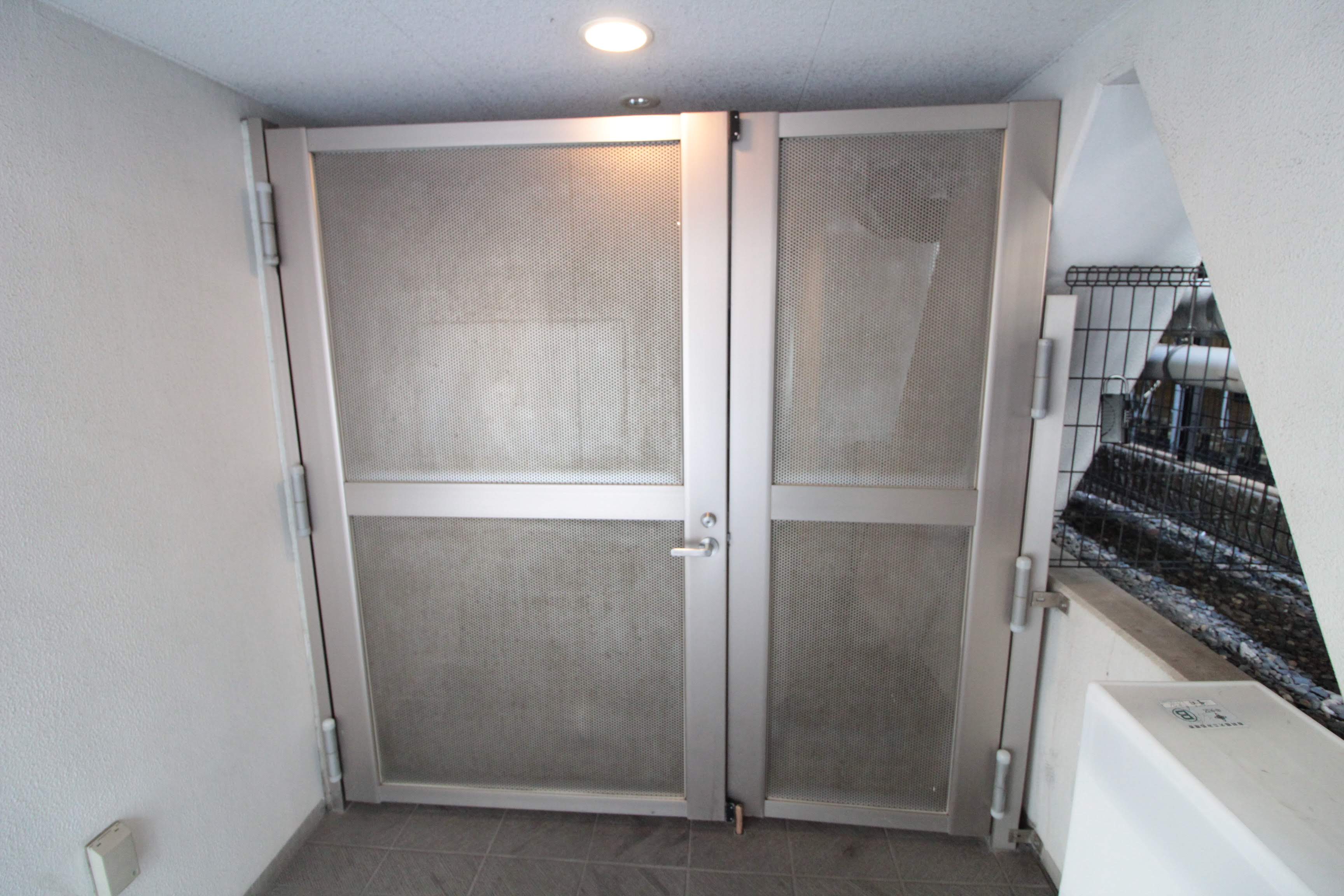 廊下の途中にあるこちらのドアは駐輪場への出入口です。