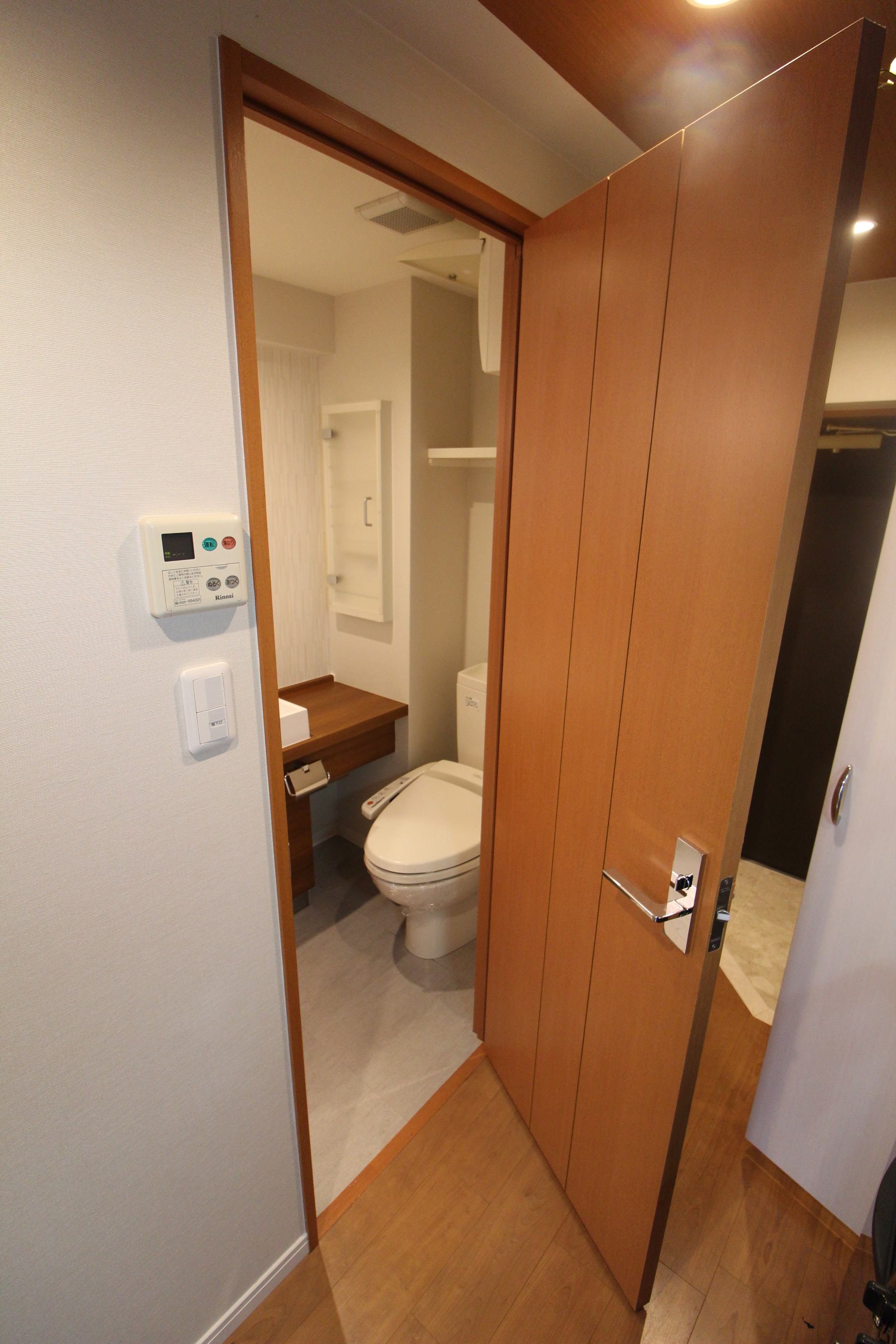 それではキッチンの前にあるトイレ、バスルームをご紹介します。