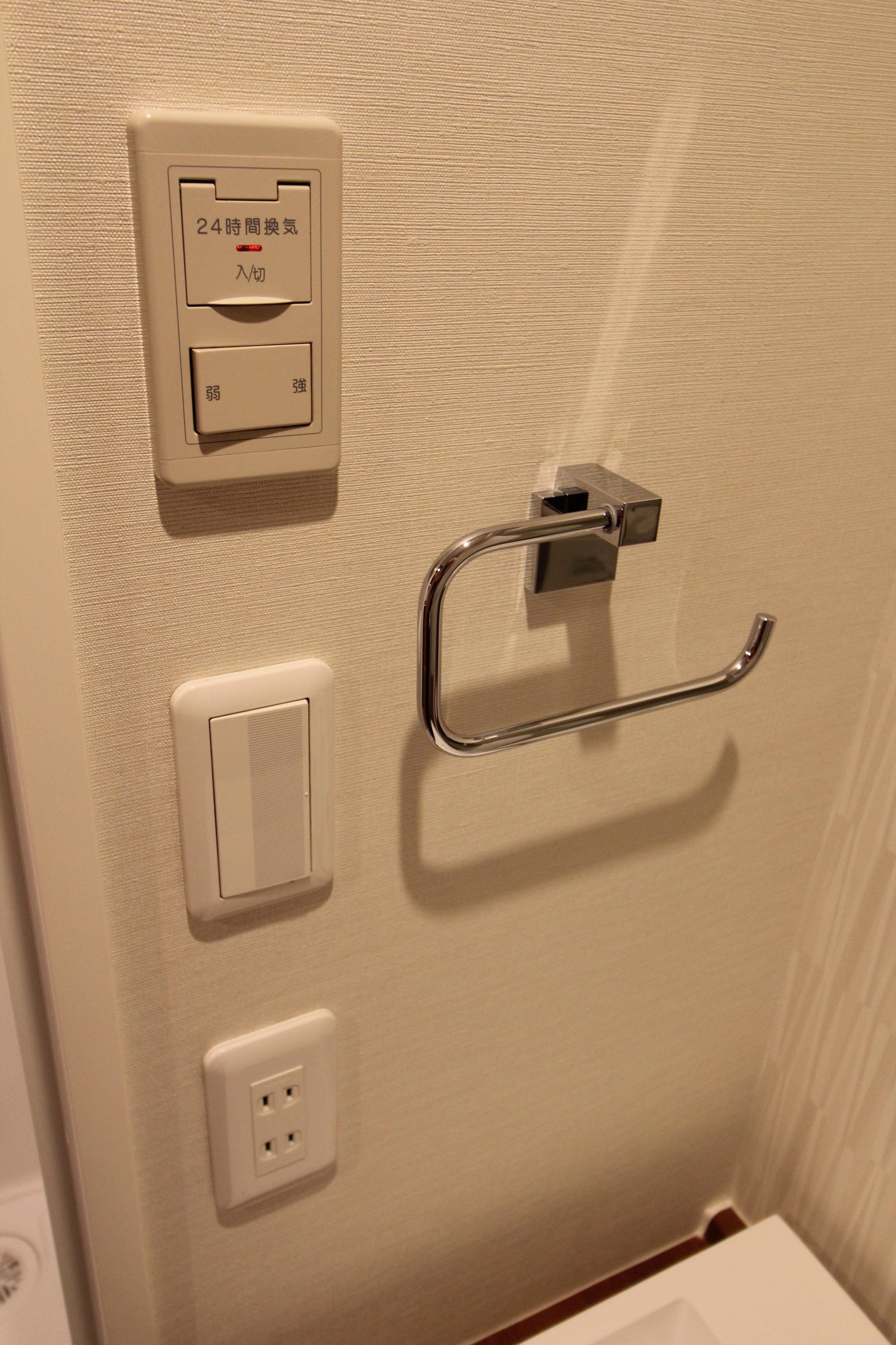 手洗い場の壁には、お風呂の電気のスイッチや24時間換気システムのボタン、タオル掛けがあります。