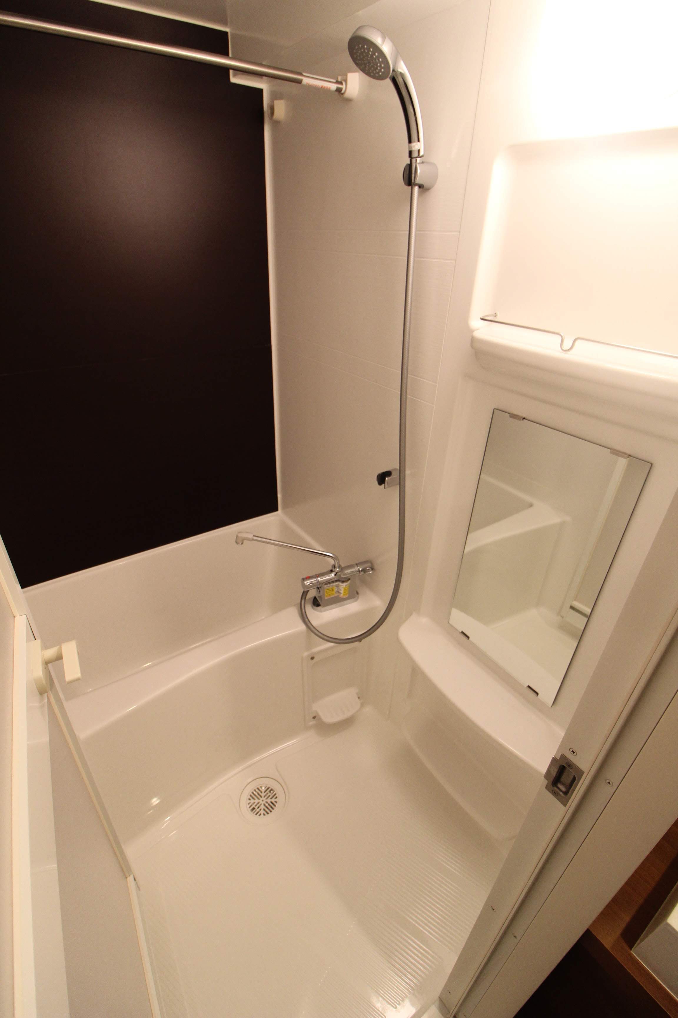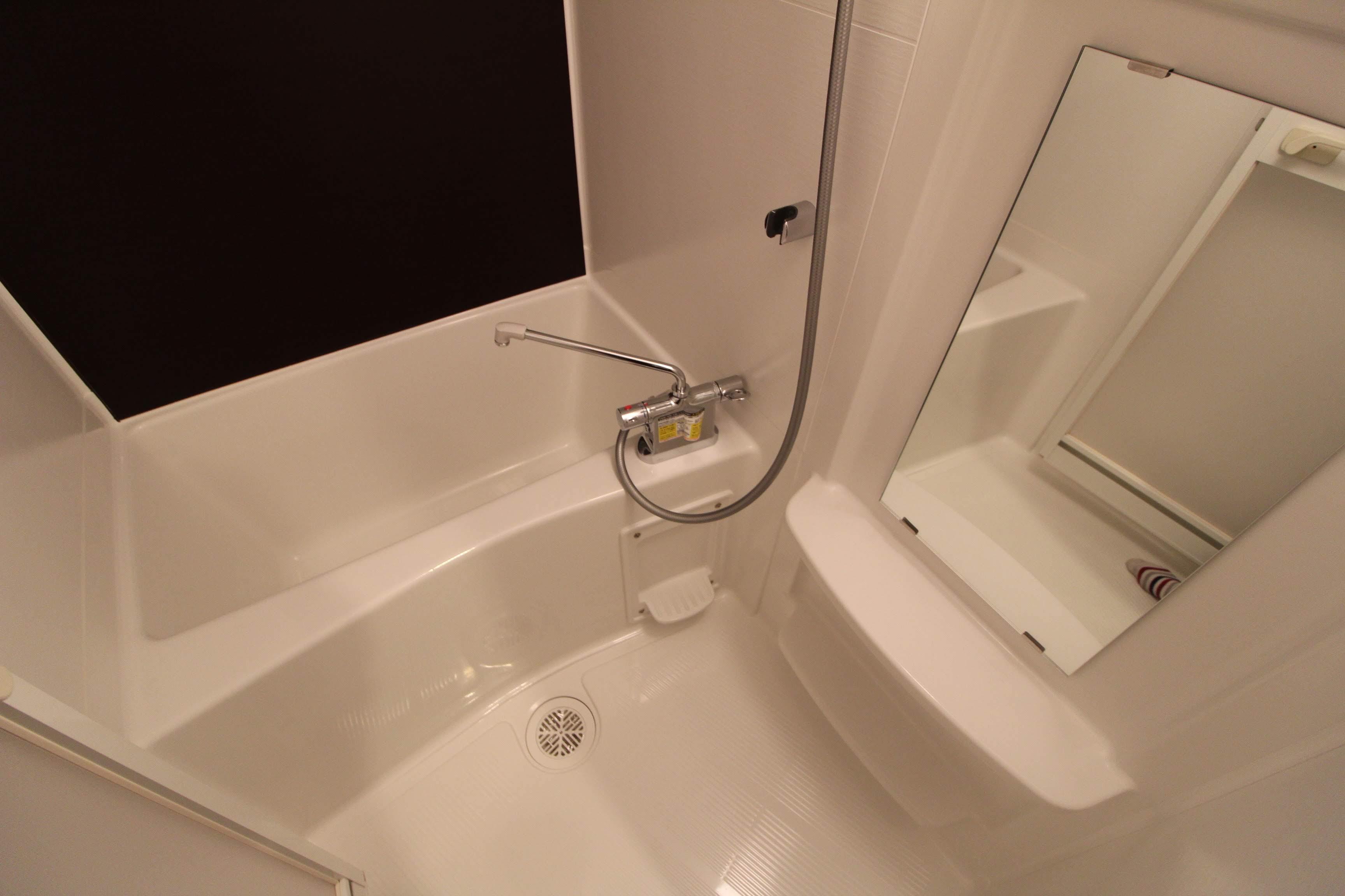 お風呂場には突張り棒があり、浴室で洗濯物を干すこともできます。