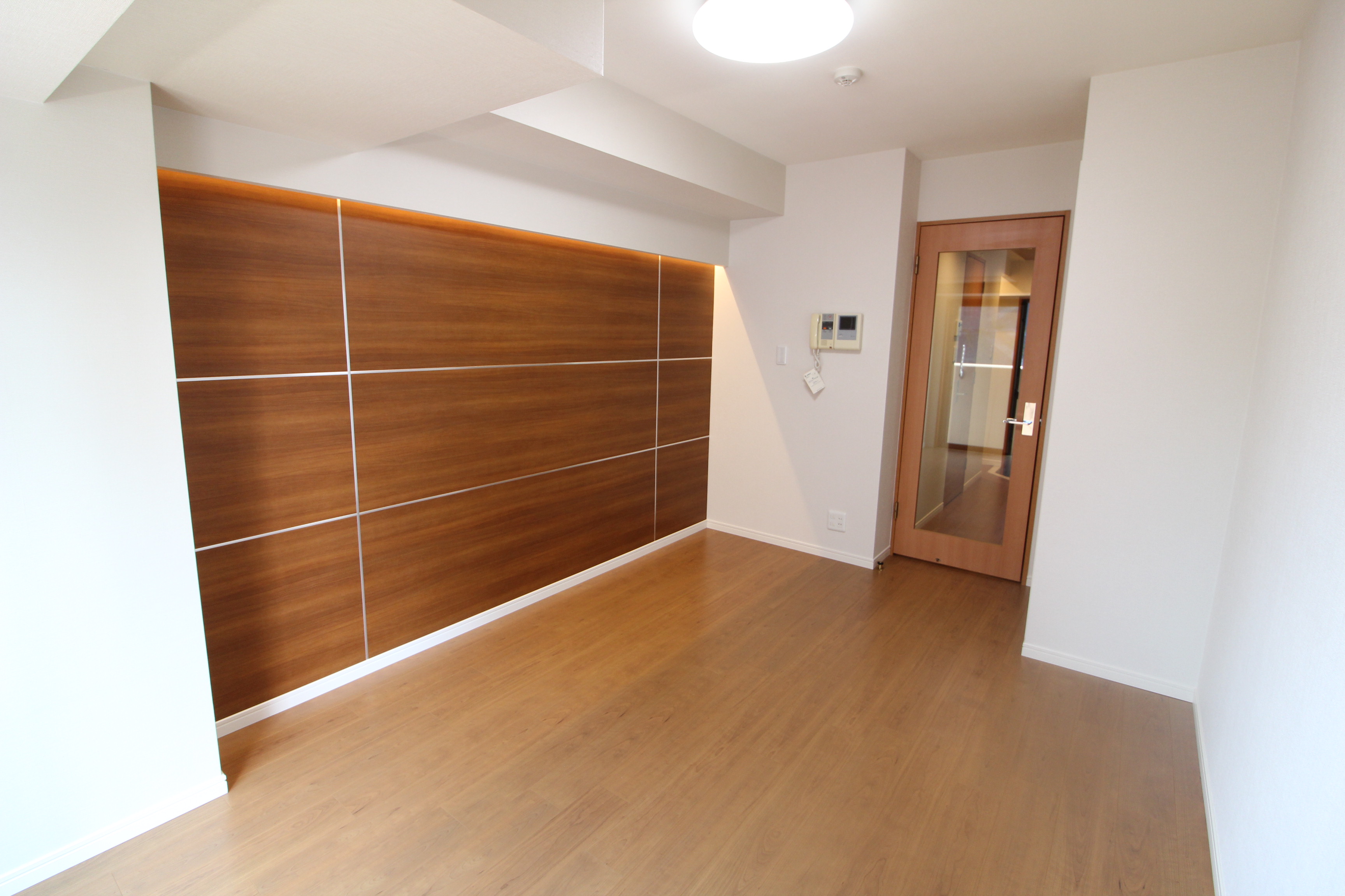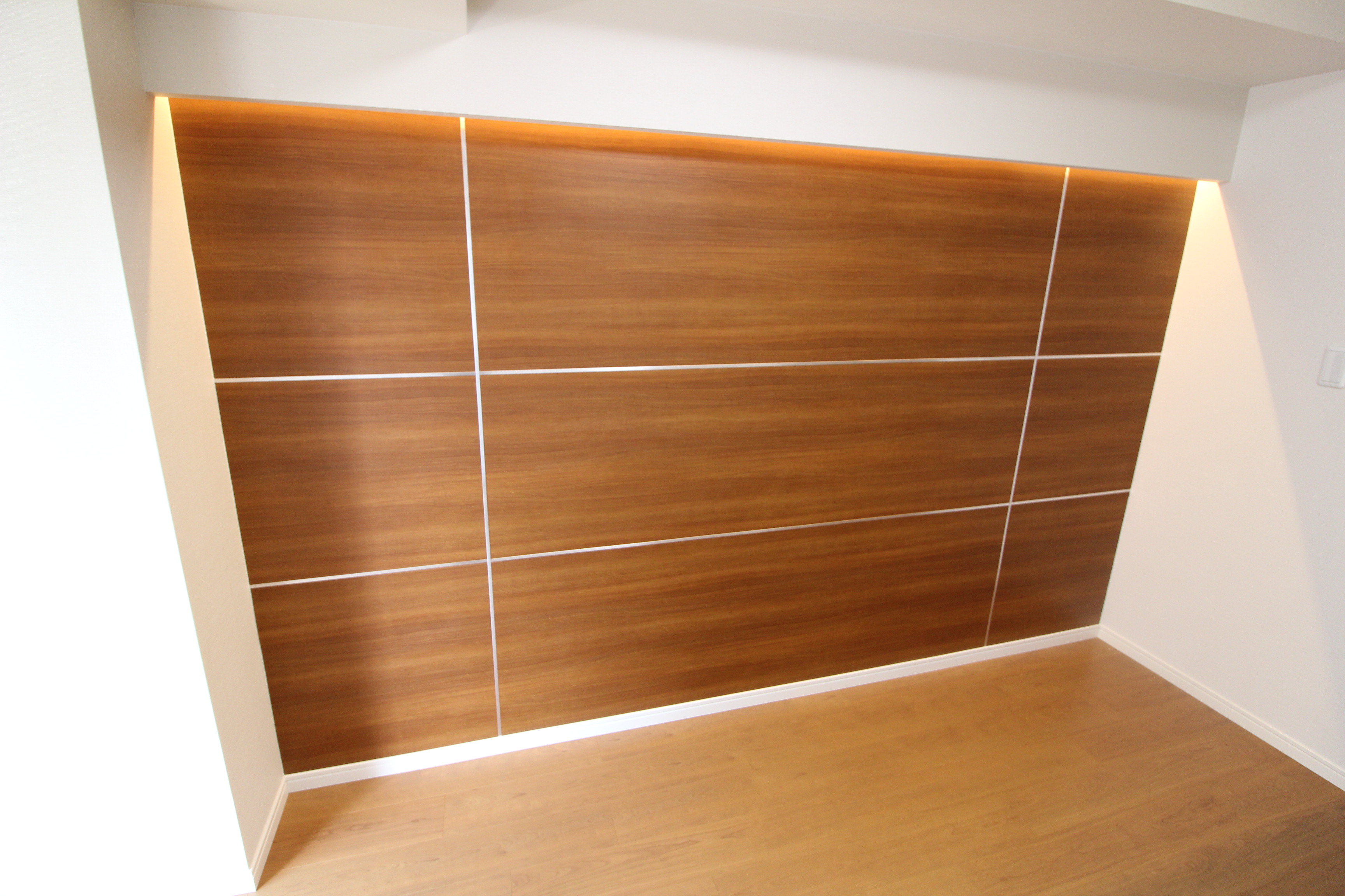 片側の壁が木目調のパネルになっているのがこの部屋最大の特徴。
