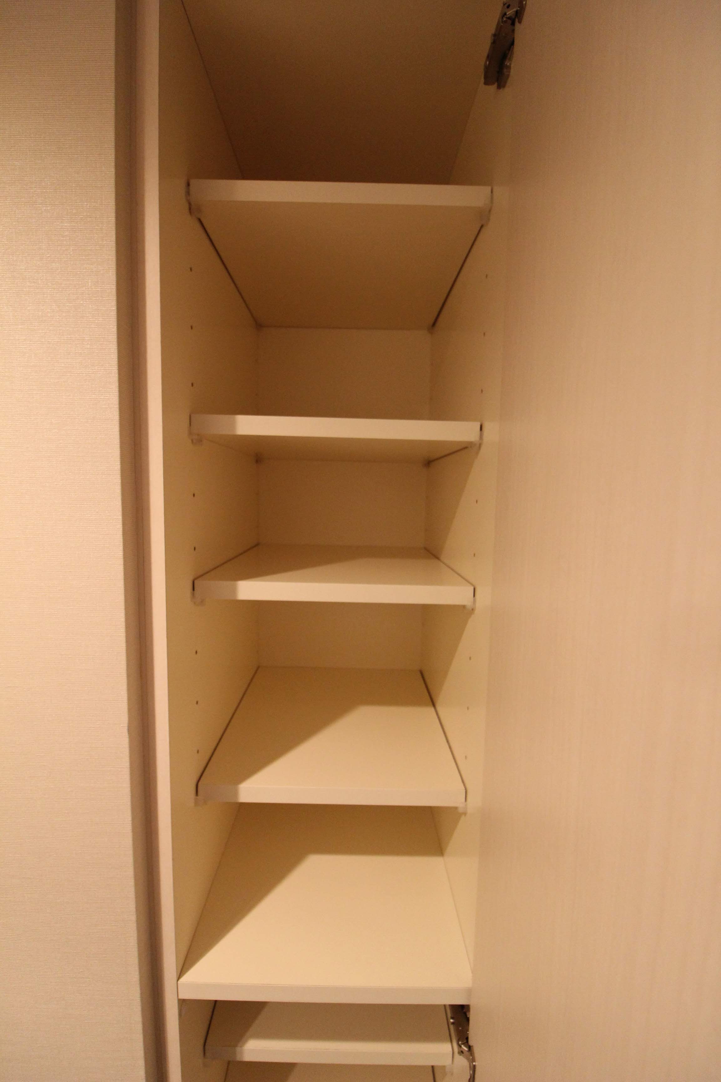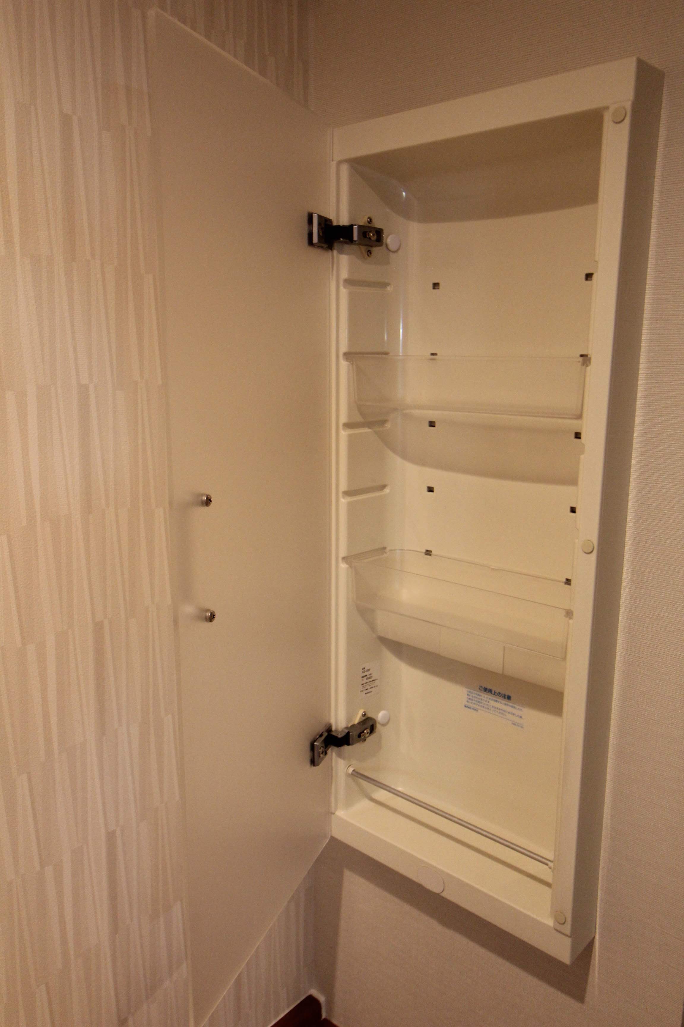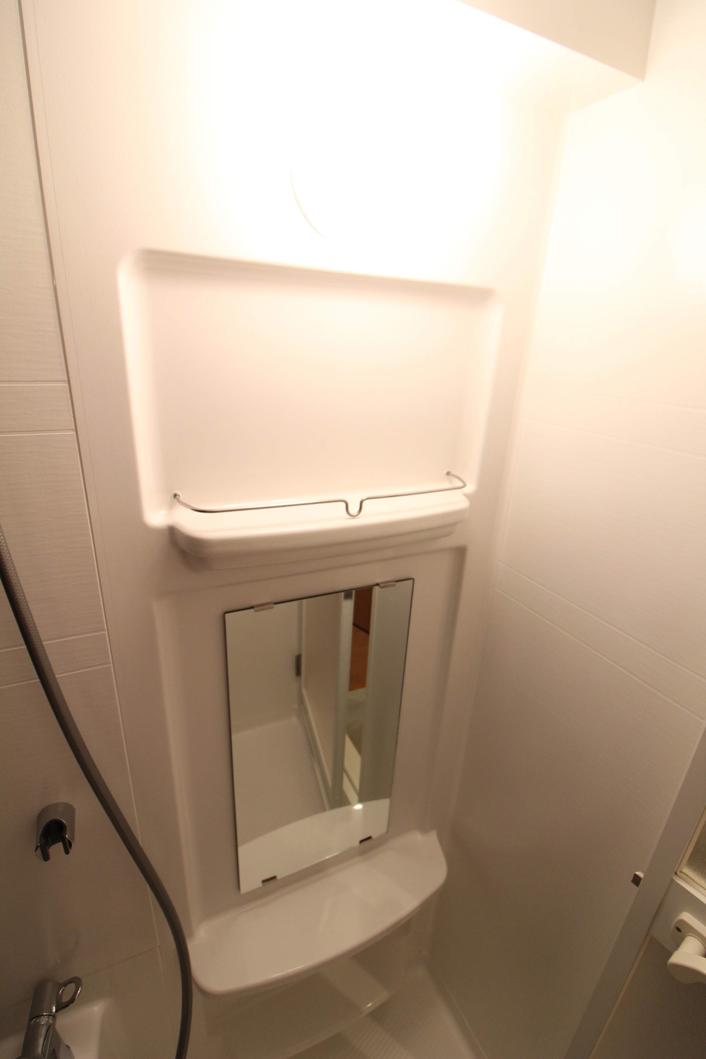 手洗い場の右の壁には、洗面台で使う小物類が入れられるの収納スペース。