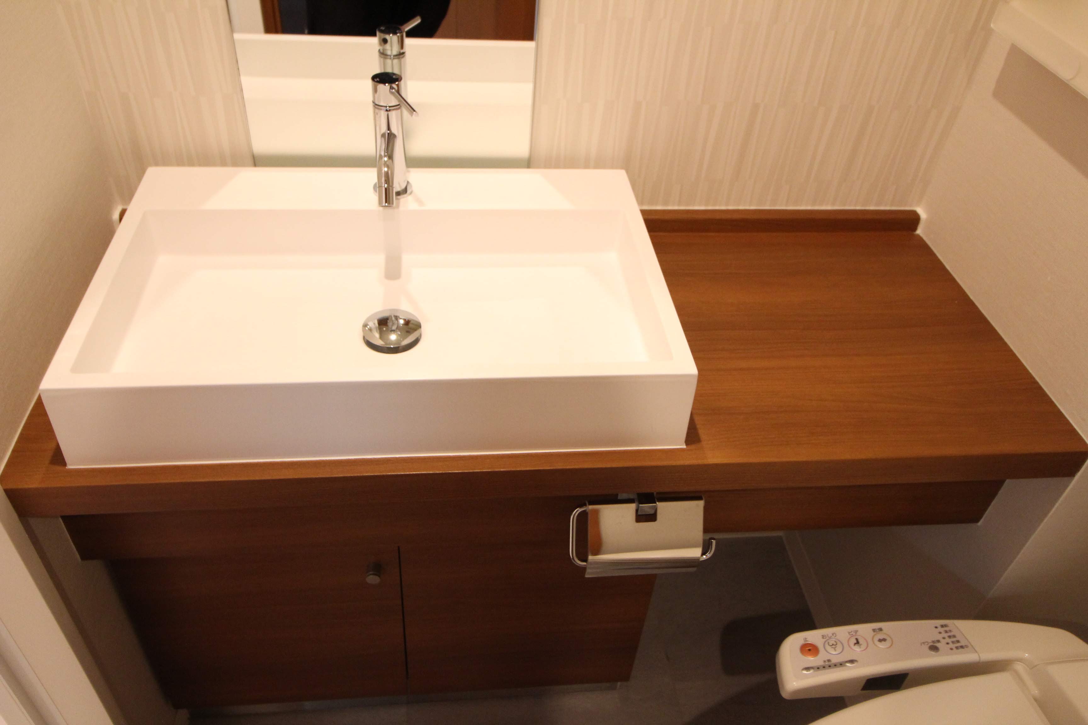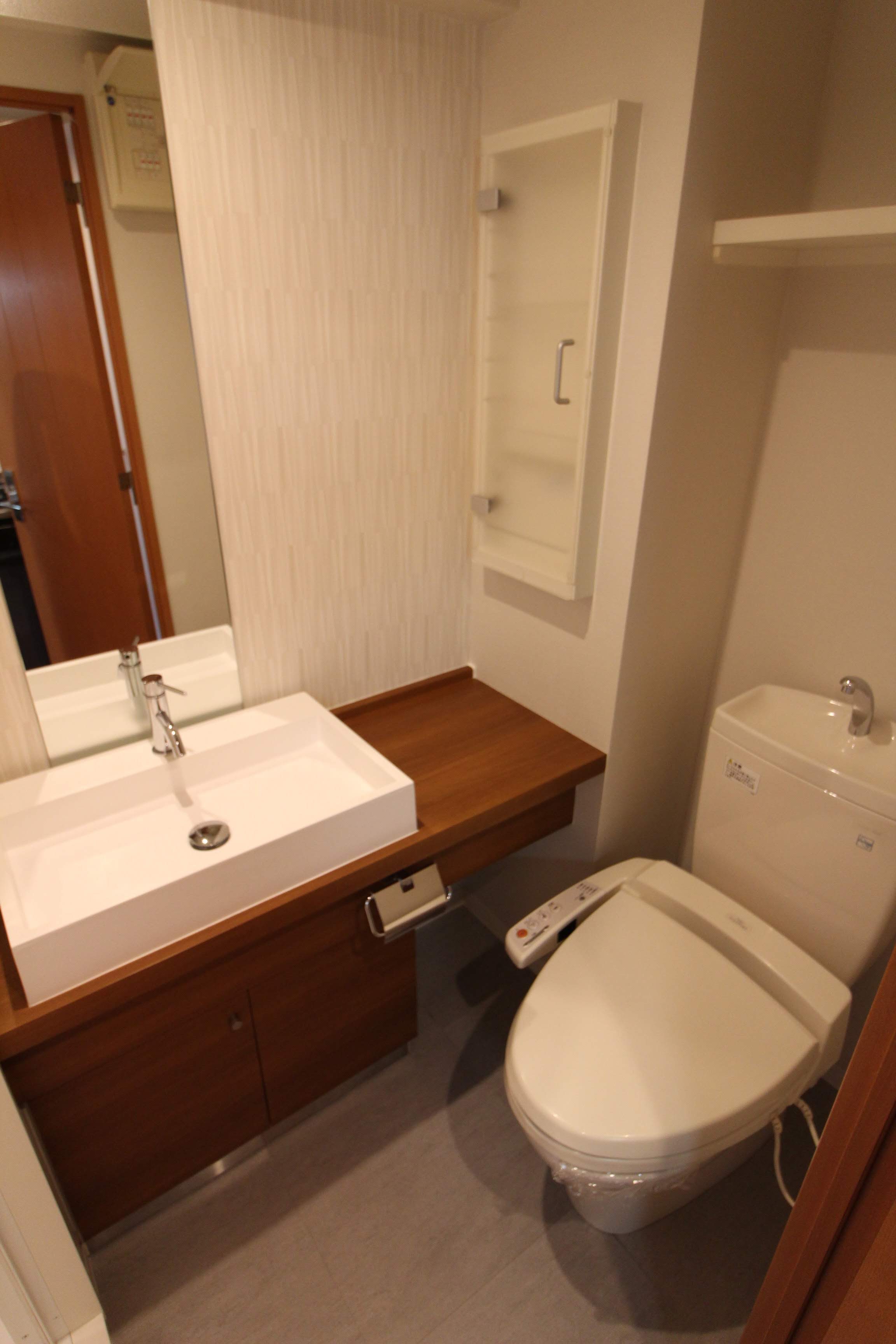 - バス・トイレは別だが、洗面台と脱衣所にトイレがある。でも作りはおしゃれ!