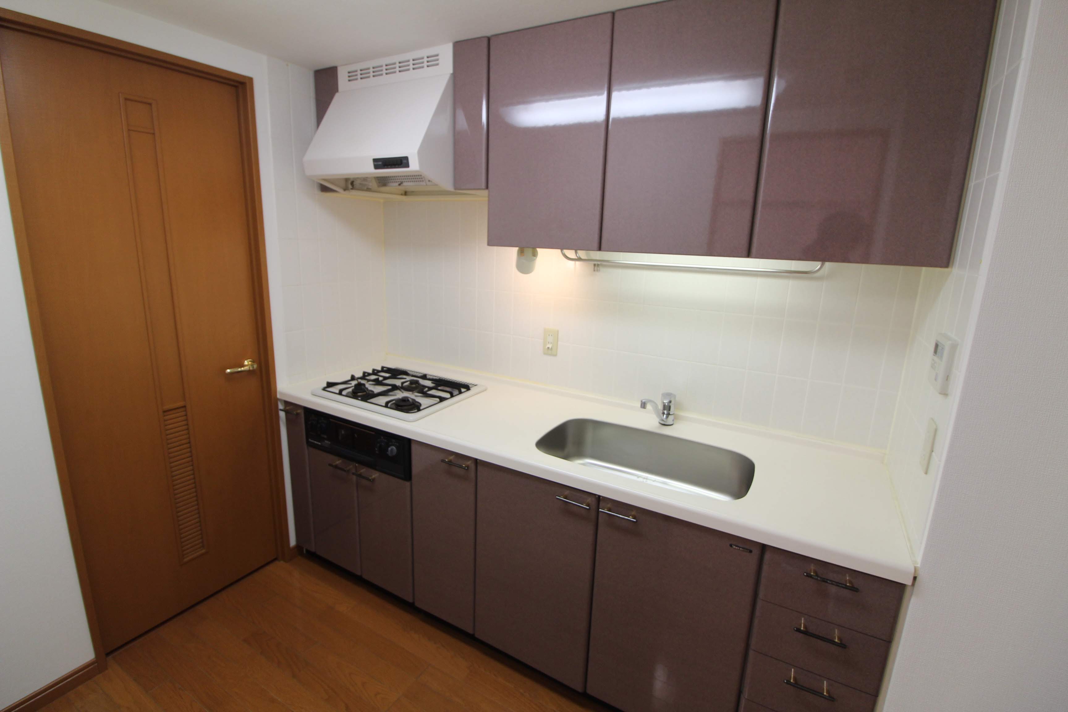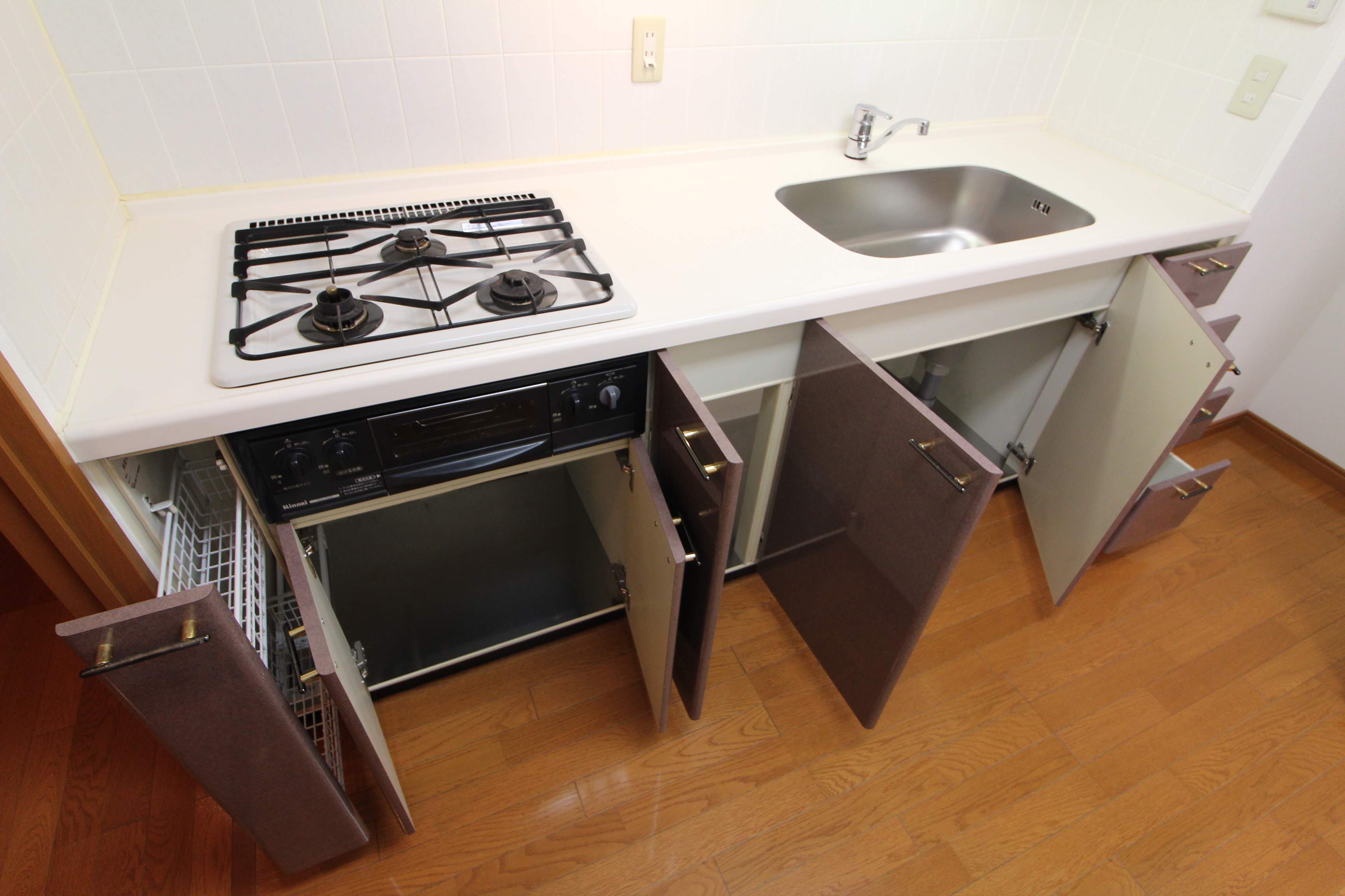 3口コンロと、水回りの横には食洗機を置けるスペースもありますよ。