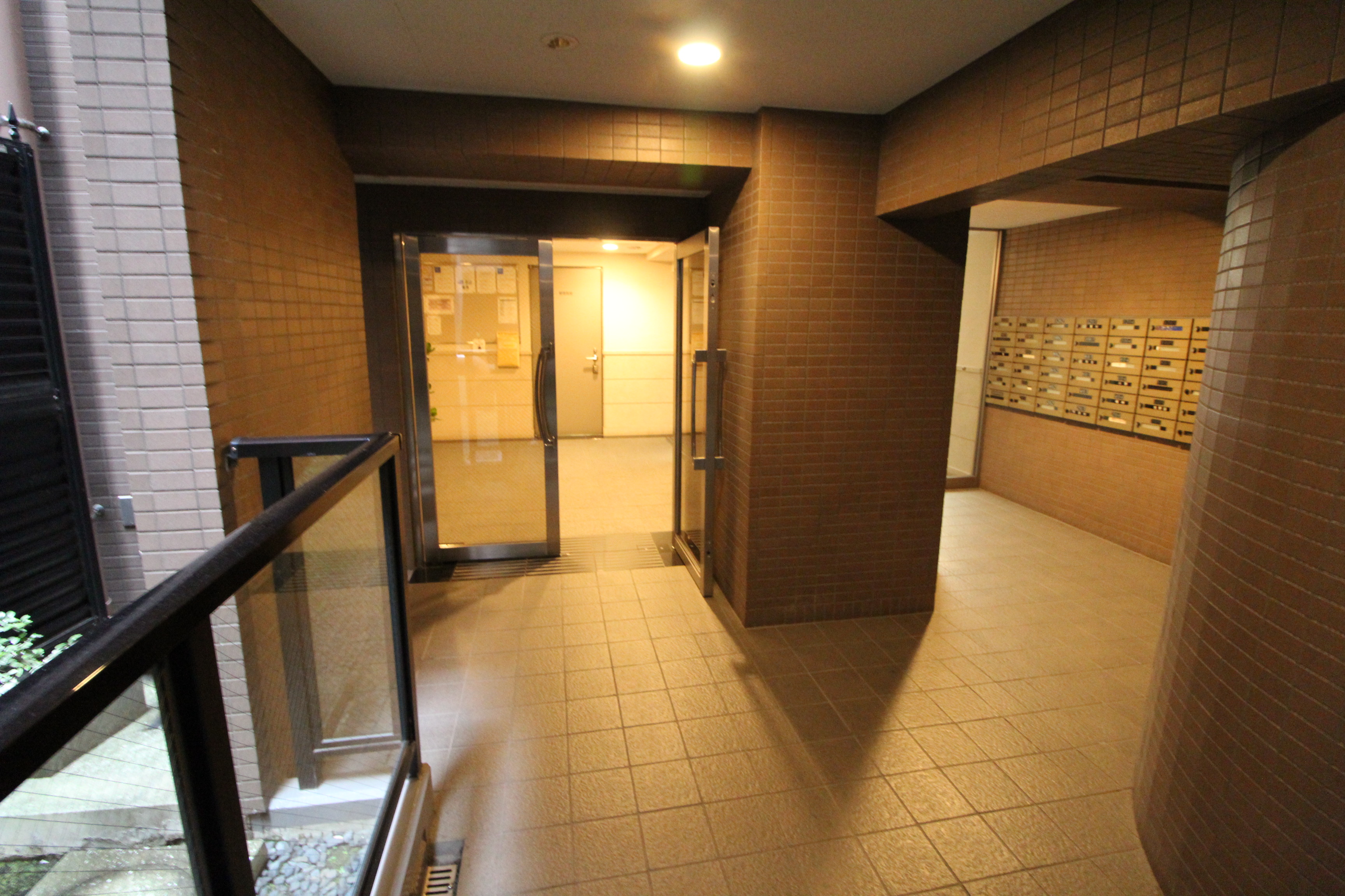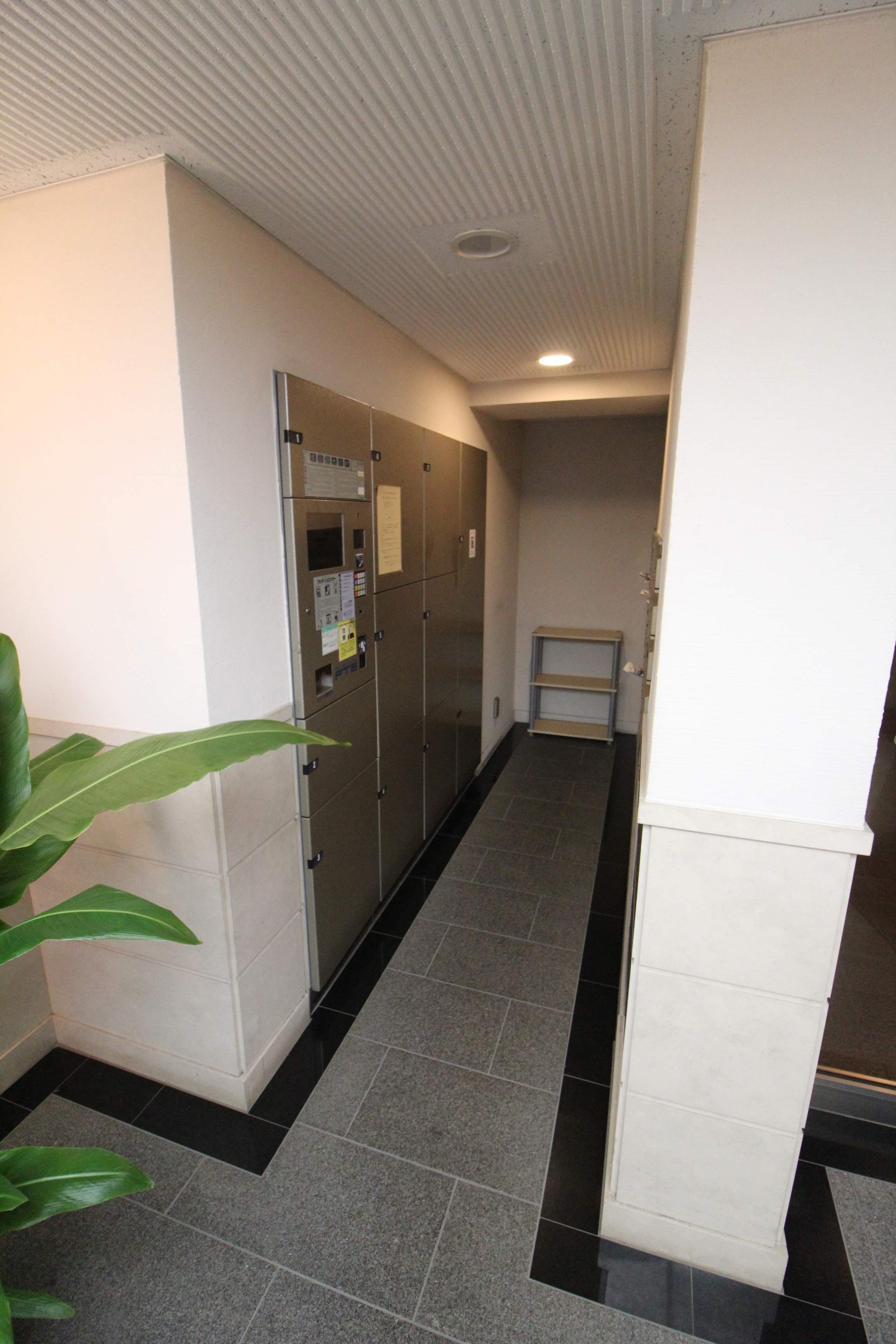 右側がオートロックで、左側奥は宅配ボックスと配達用のメールボックスです。