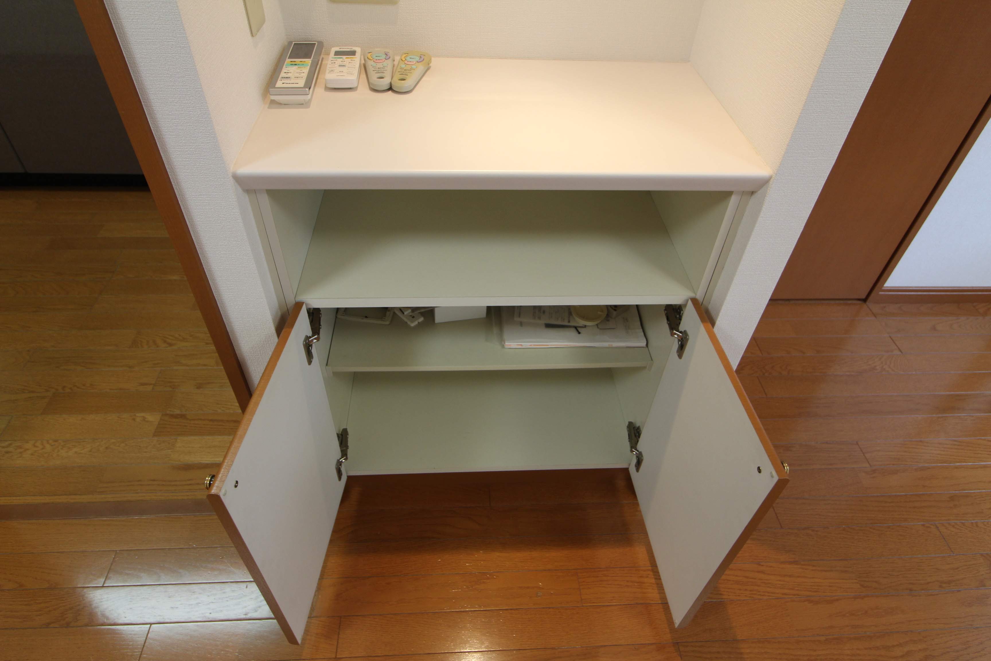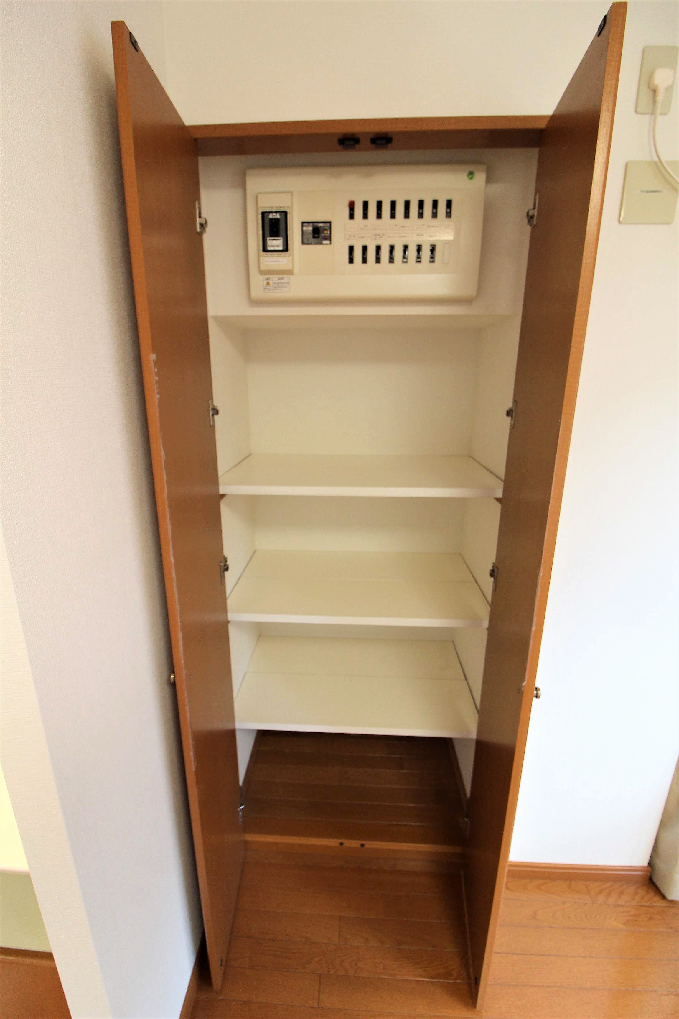 電話台横の扉はブレーカーと収納スペースです。