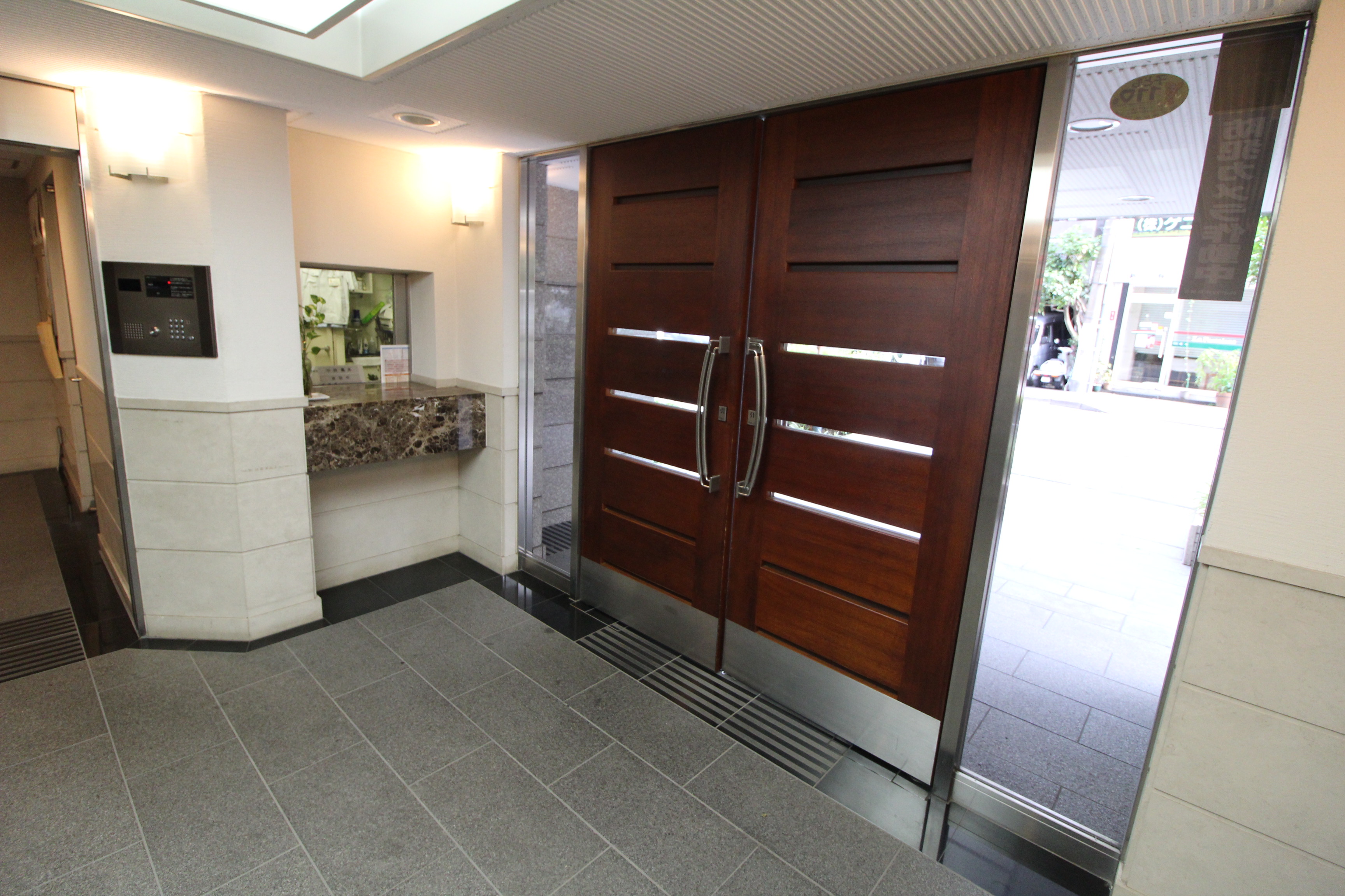 オートロック前のエントランスはグレートーンが基調。