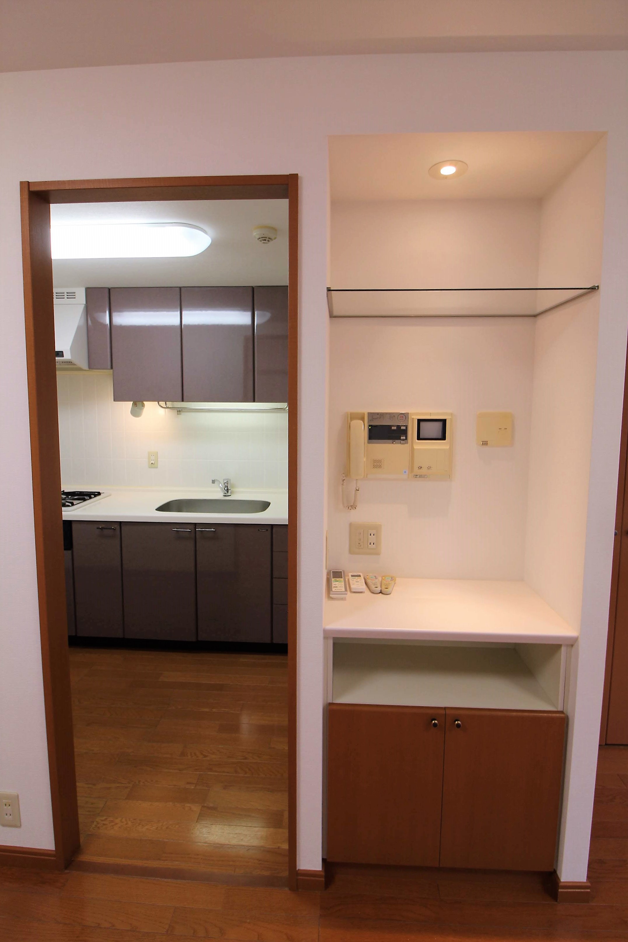 キッチンのすぐ隣には、電話台も兼ねた各種リモコン操作ができるカウンタースペースがあります!