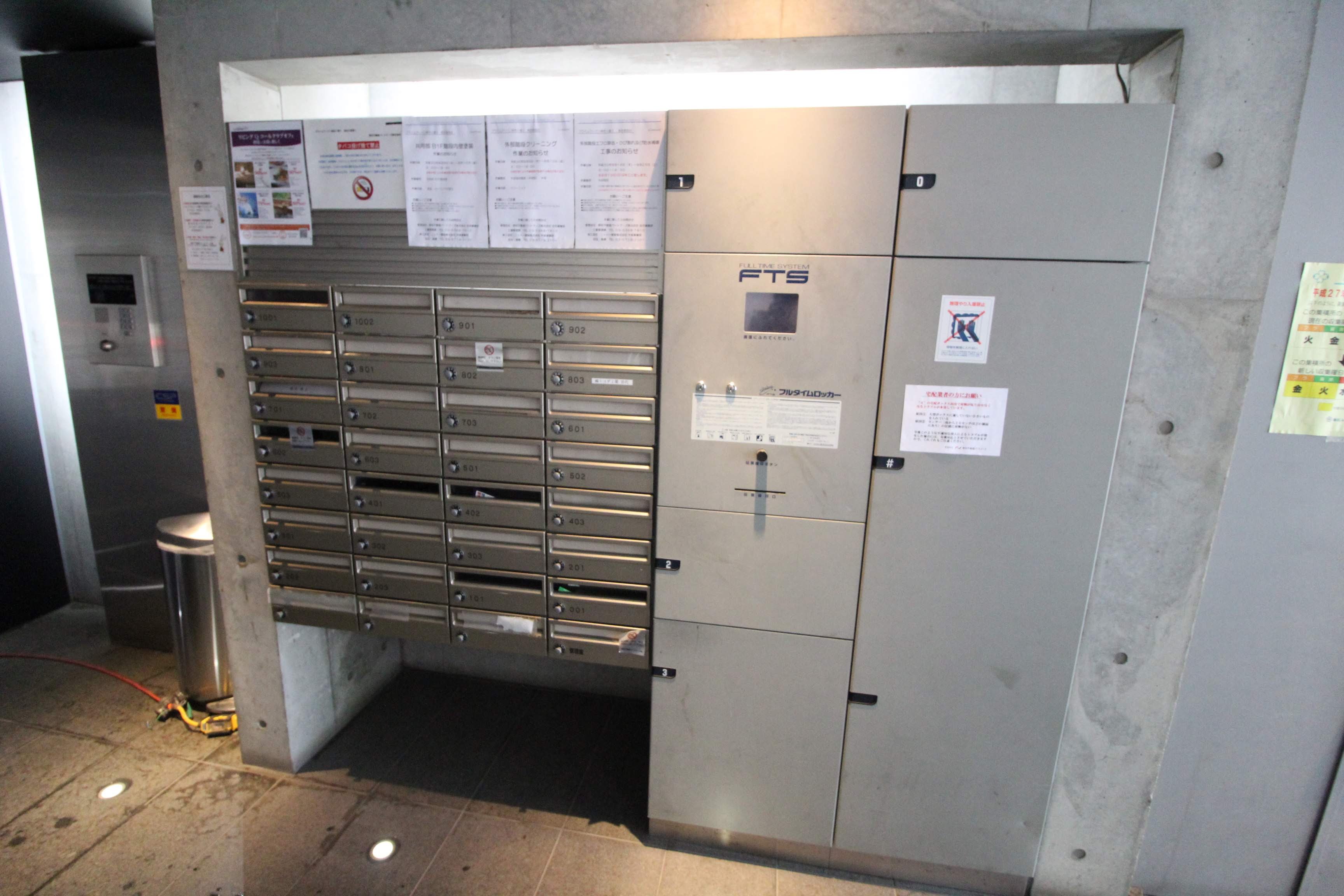 廊下の右側には、メールボックスと宅配ボックスが設置されています。