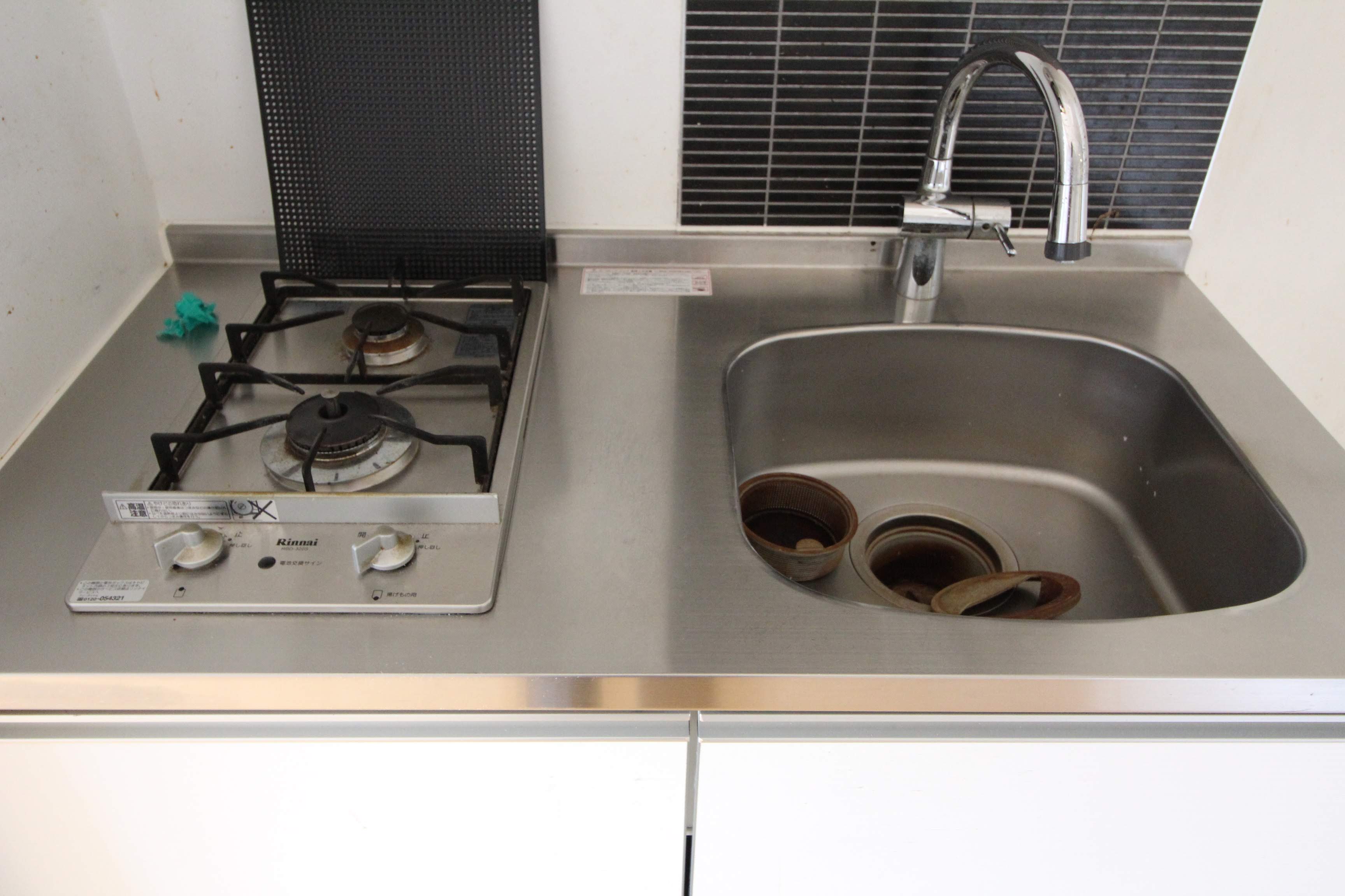 クリーニング前なので見栄えは悪いですが、2口コンロのガスキッチンです。