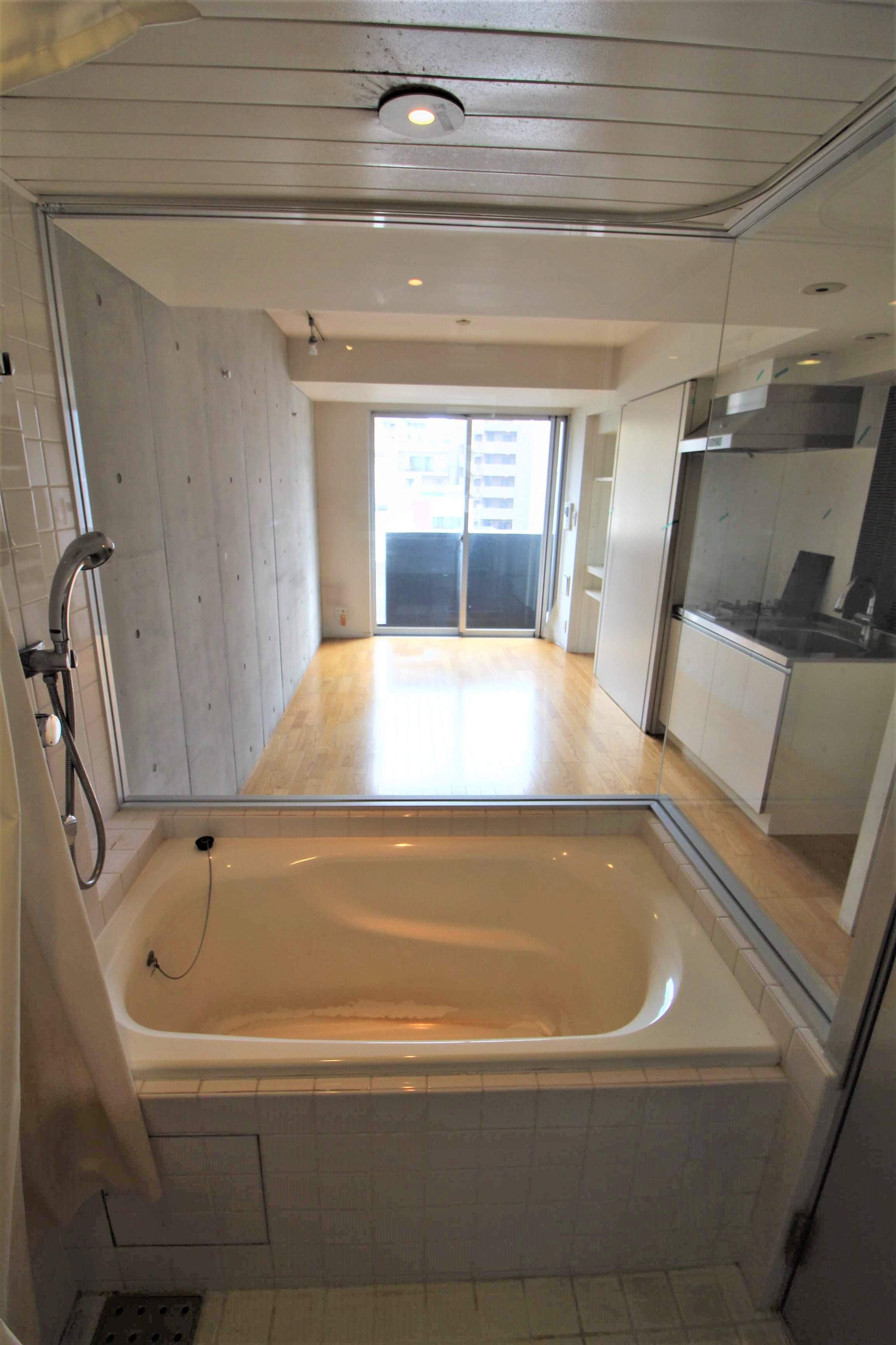 • リビングから丸見えのガラス張りのバスルーム