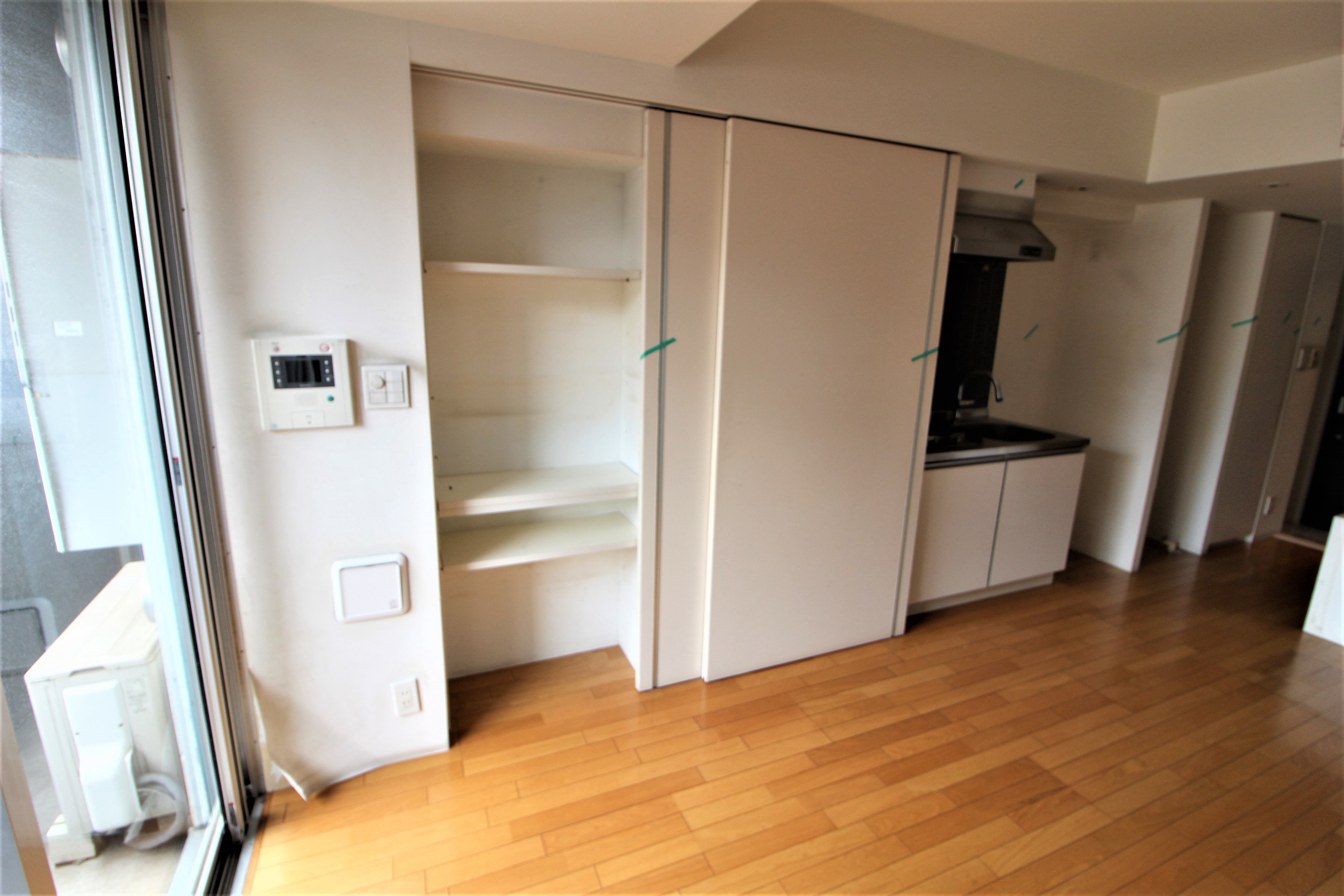 窓付近にクローゼットが2つと廊下側にキッチン。