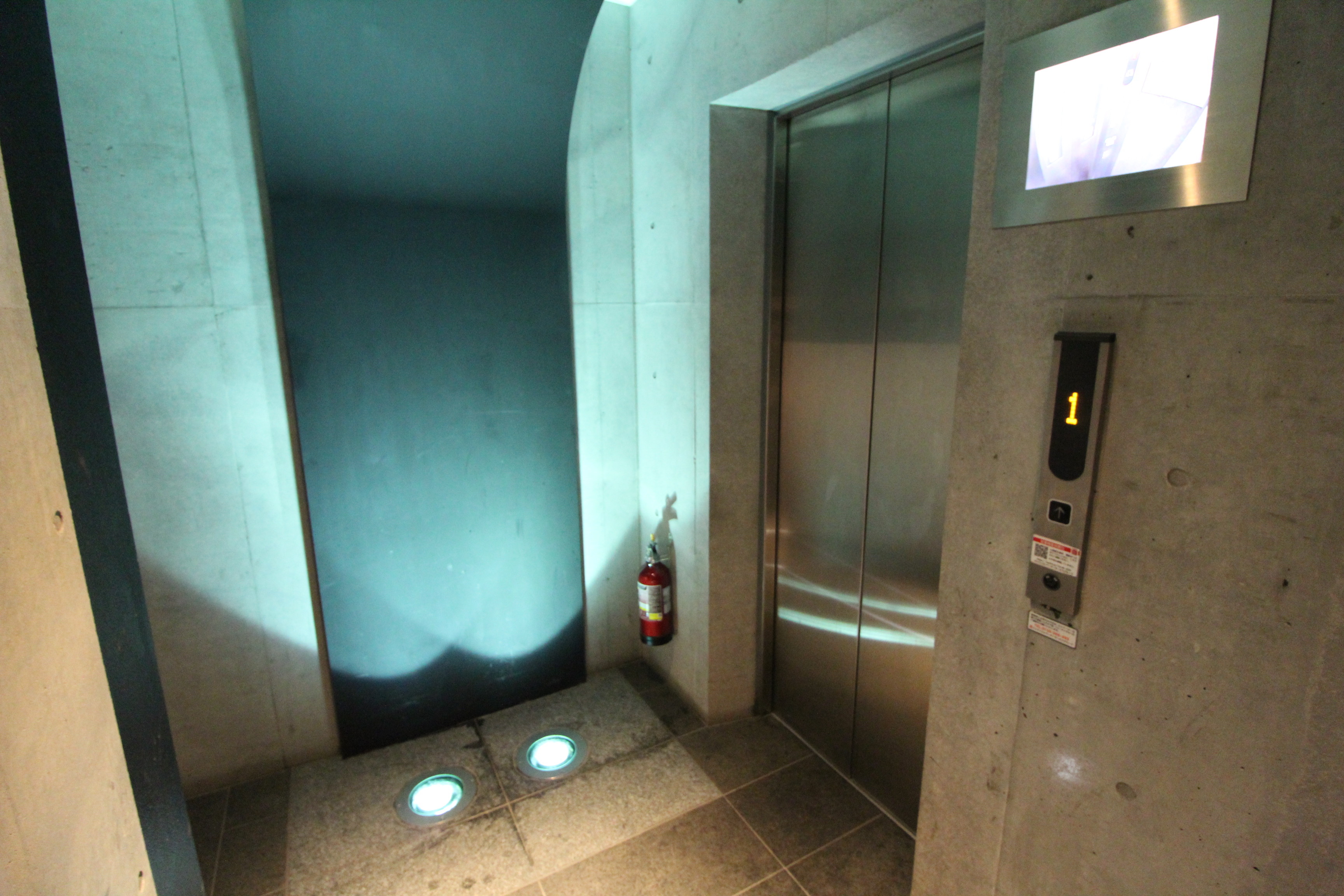 エレベーターの横には消火器と、エレベーター内の監視カメラディスプレイがあります。