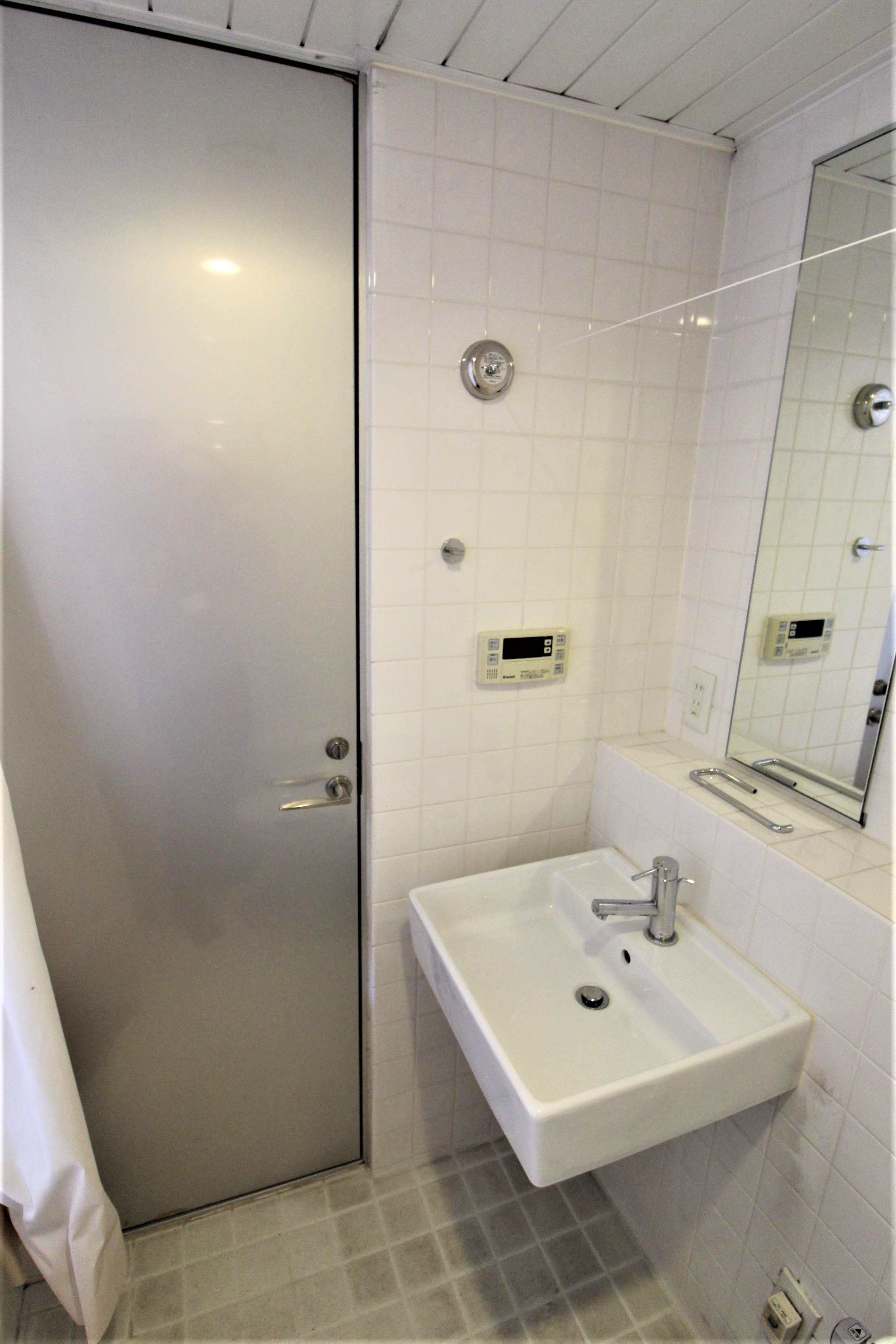 トイレとバスルームの壁と床は全体がホワイトのタイルで統一されています。