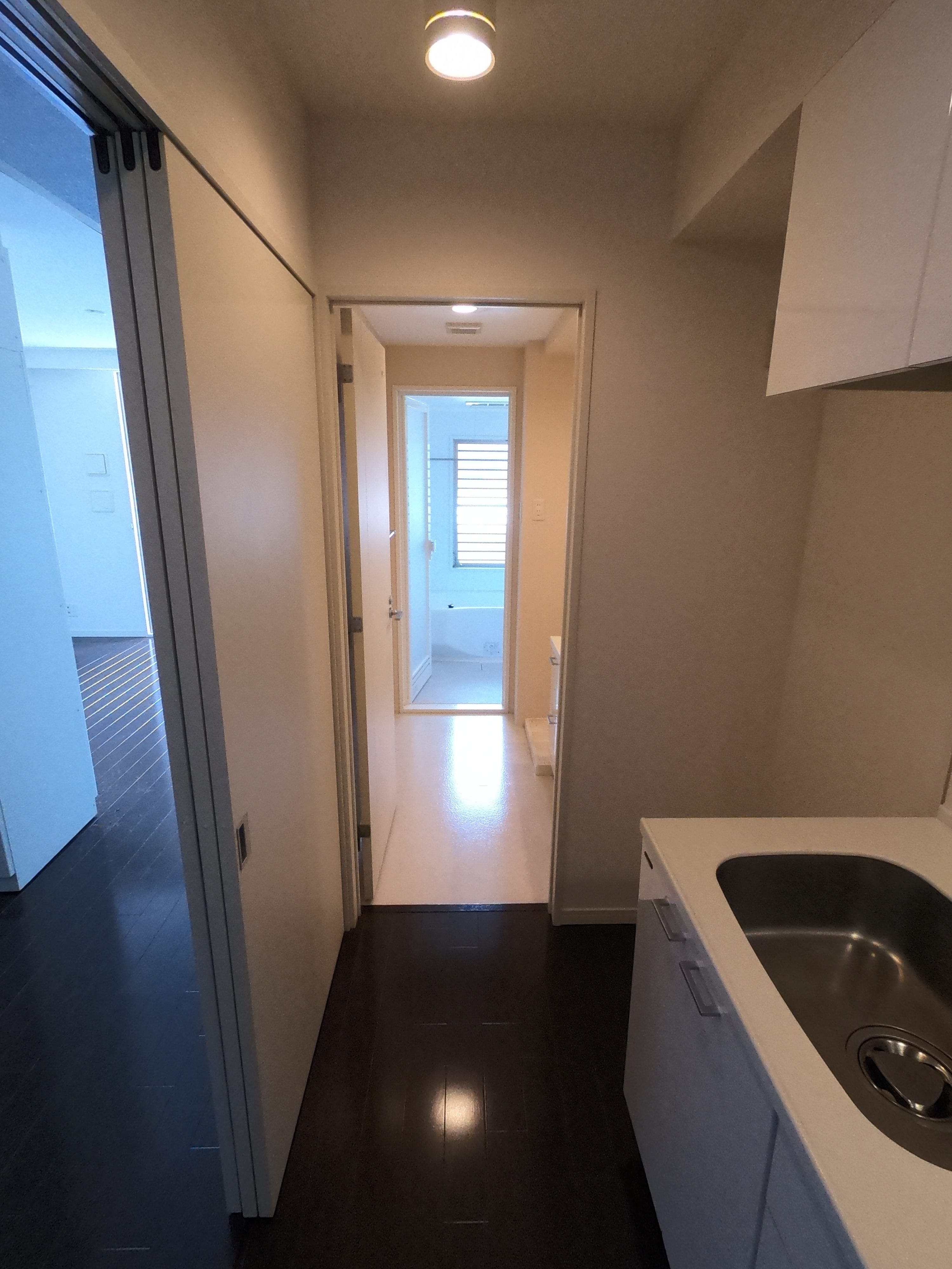 キッチンの横から部屋に平行して洗面所、お風呂へと続いています。